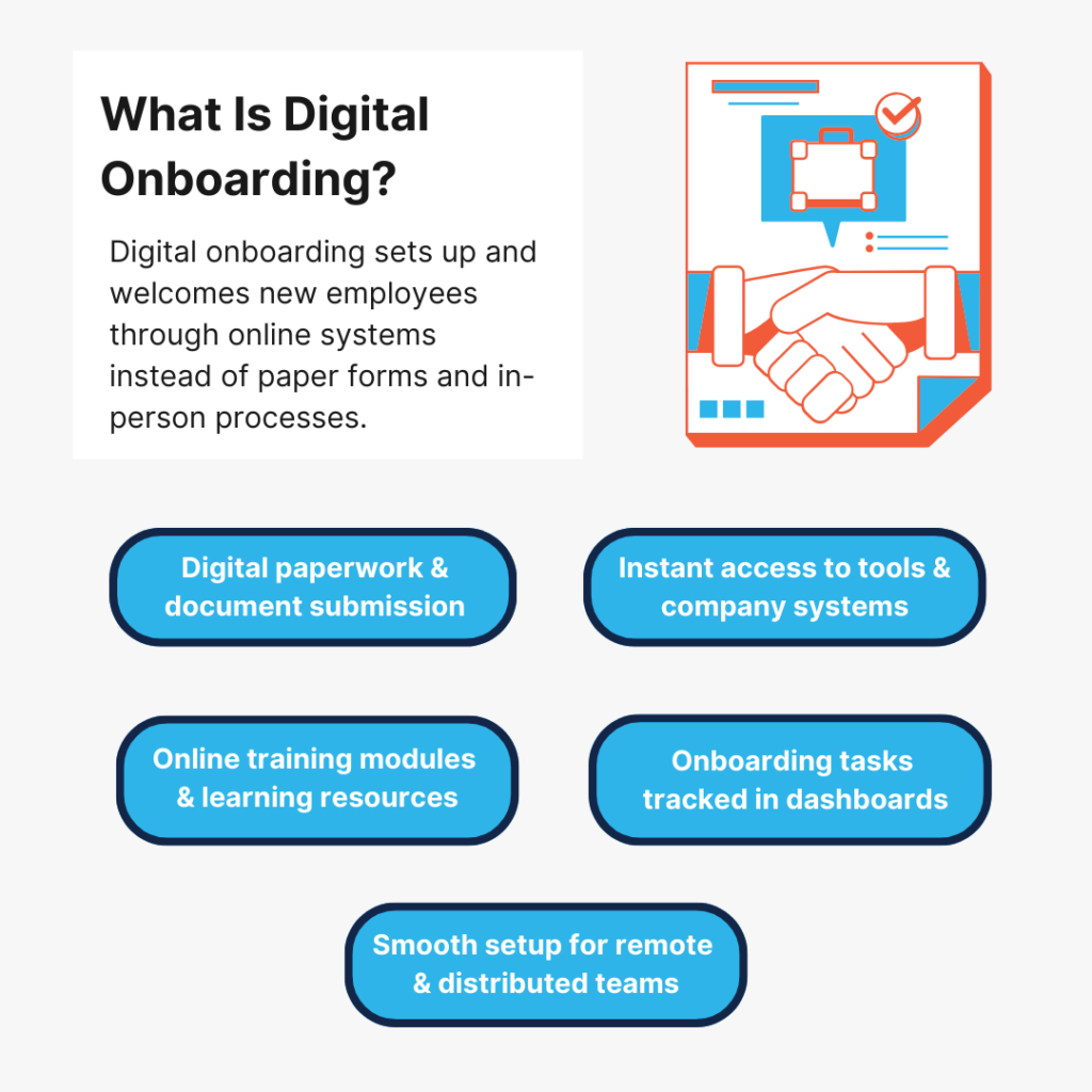 Digital onboarding is the process of welcoming and setting up a new employee using online tools instead of manual paperwork and in-person steps.